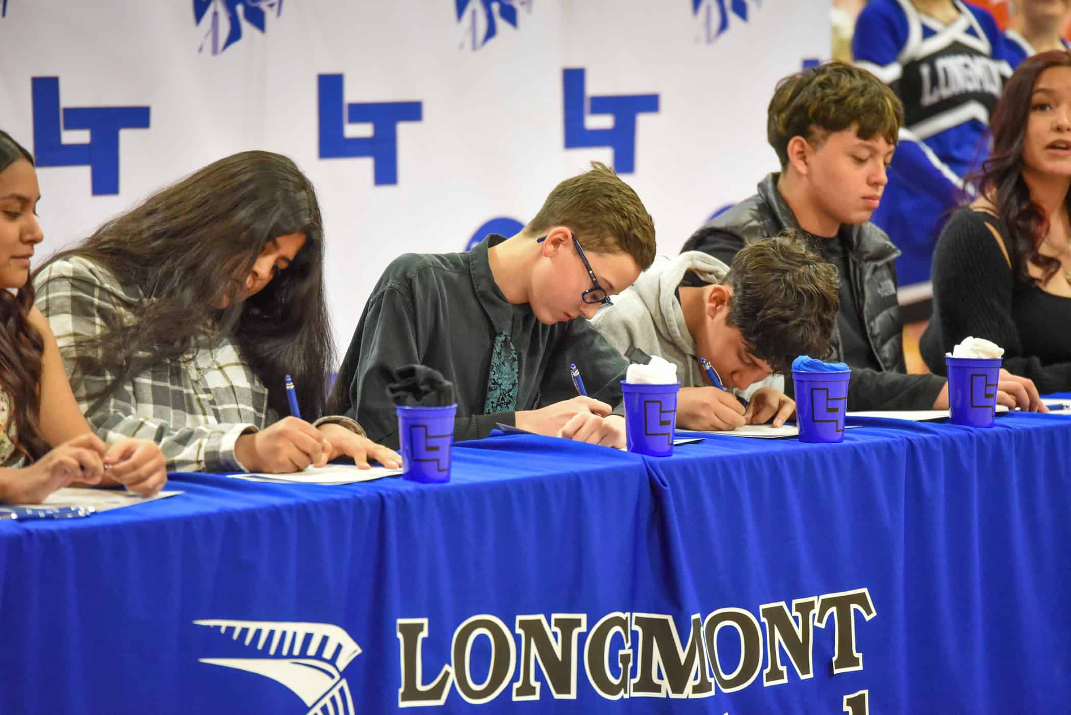 Longs Peak Middle School hosted a special signing ceremony to celebrate more than 40 eighth grade students who had been accepted into high school focus programs. Modeled after high school athletic signing events, this all-school assembly took place on Wednesday, April 2 from 2:30 p.m. to 3:15 p.m., recognizing students’ hard work and dedication in preparing for advanced academic pathways.