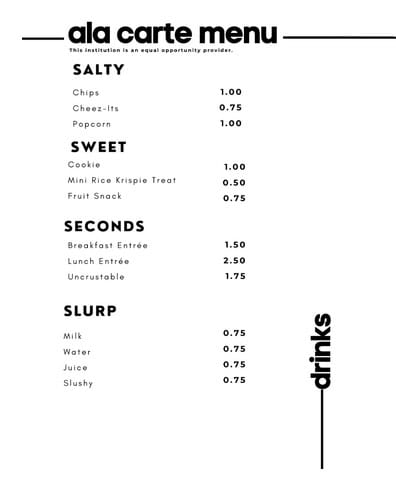 Ala Carte: In addition to free breakfast and lunch, our cafeteria will be offering purchase options for students who would like to do so ala carte. Here is what is going to be offered for purchase.